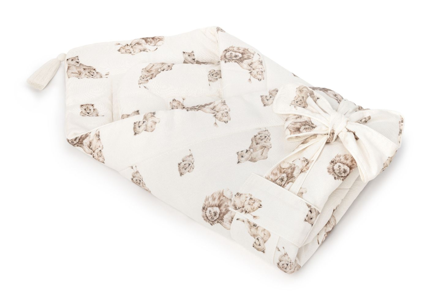 Ein extrem zartes Kegelmodell aus 100% Bambusgewebe. Sie wird dem Baby vom Tag der Geburt an dienen, es einwickeln und ihm ein Gefühl der Sicherheit geben. Es ist ein 2-in-1-Produkt - es kann als Kegel und nach dem Entfalten als Bettdecke verwendet werden. Der Kegel aus der Lions-Kollektion ist in einer Ecke mit einem natürlichen Geflecht verziert.