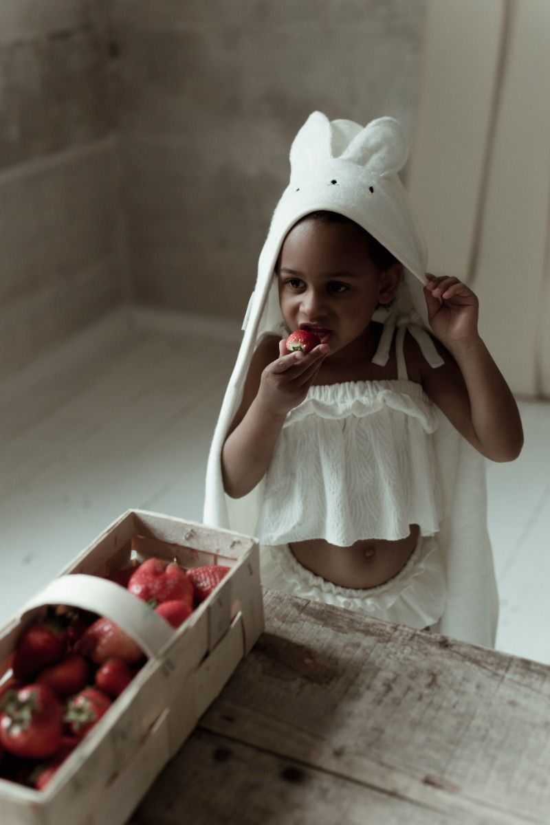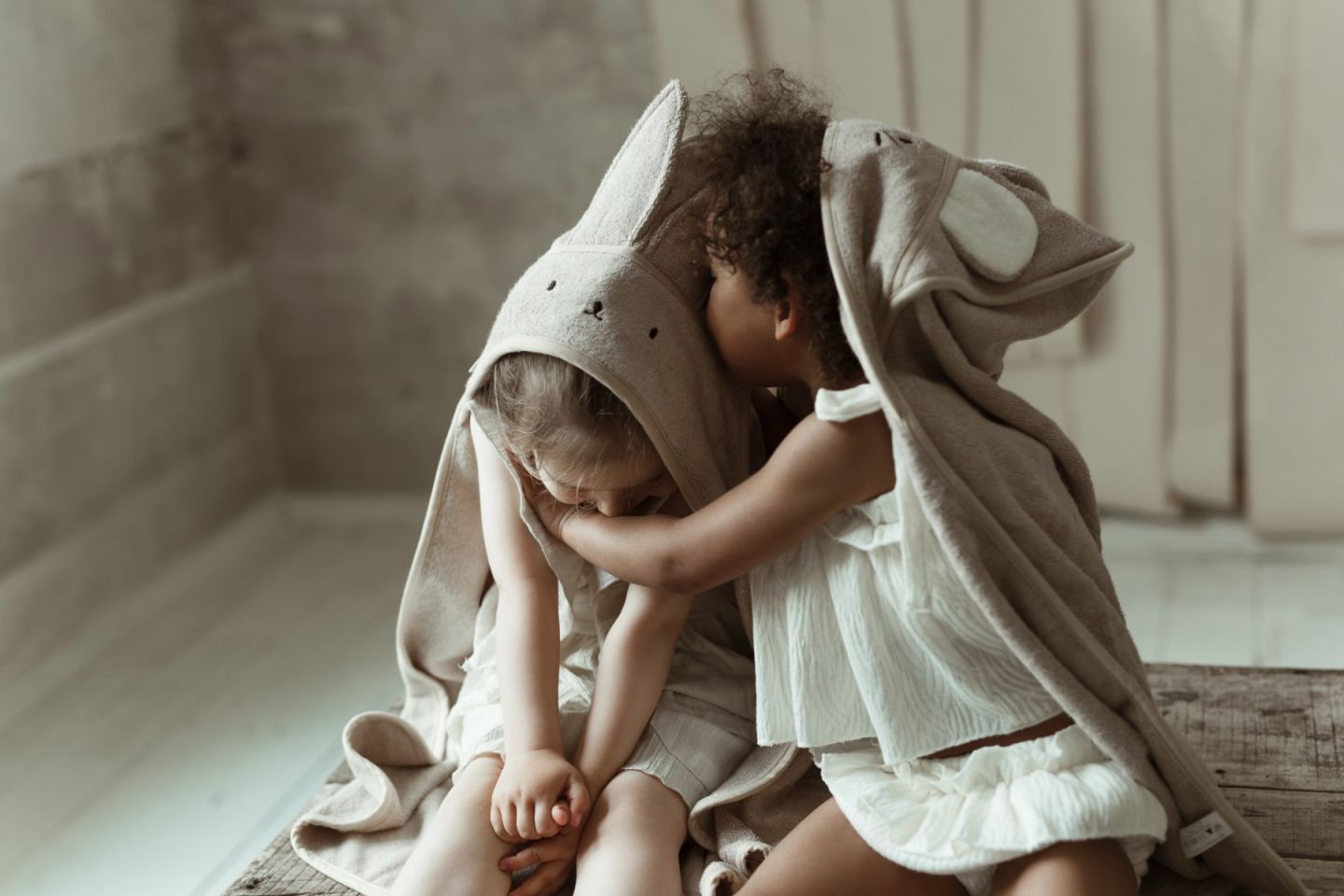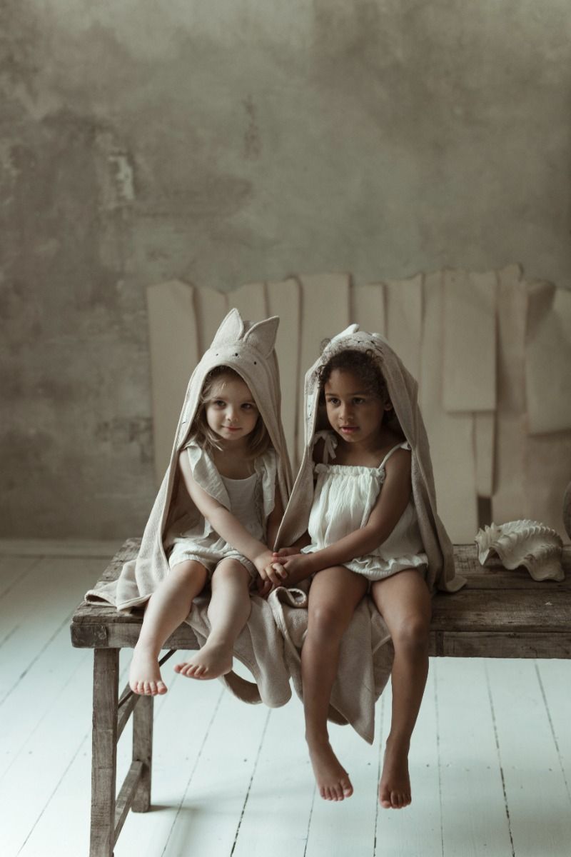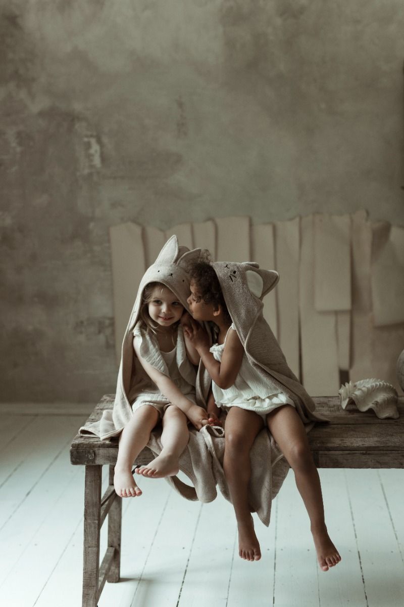 Das Handtuch hat niedliche Ohren und eine Stickerei auf der Kapuze, während sich auf der Rückseite eine funktionelle Halskrause für die Eltern befindet. Diese Lösung ermöglicht es den Eltern, das Baby unmittelbar nach dem Baden zu kuscheln, was ein Gefühl der Nähe und Sicherheit vermittelt.