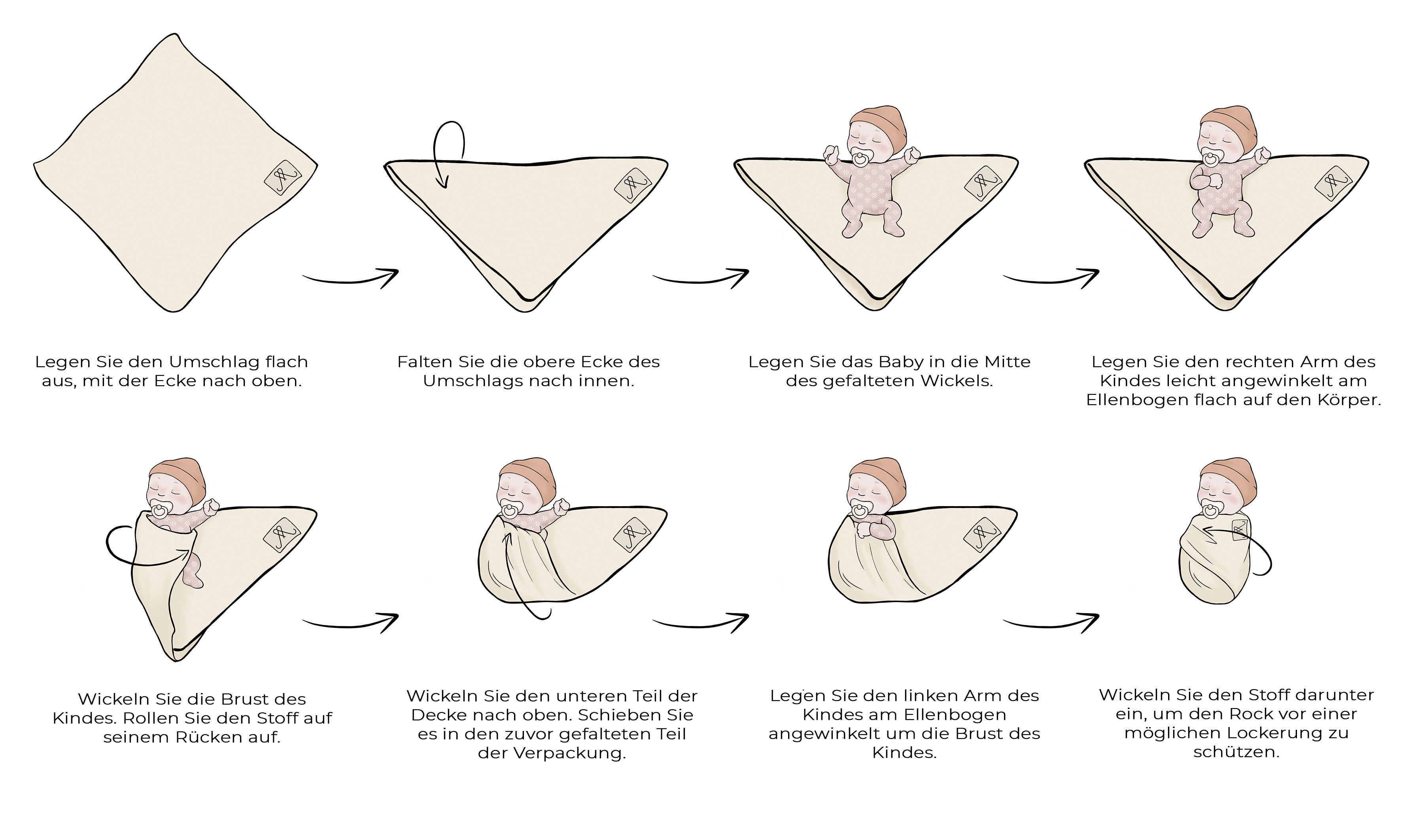 Das Wickeln des Babys ist für die meisten Eltern eine bewährte Methode zur Beruhigung des Babys. Manchmal ist es schwierig, ein weinendes und aufgeregtes Baby zu beruhigen, vor allem, wenn man es in den Schlaf wiegt. Hier kommt ein Bündel zur Hilfe, das dem eingewickelten Baby das Einschlafen erleichtert und einen bequemeren Schlaf ermöglicht. Wir empfehlen Ihnen, sich für ein Bambustuch zu entscheiden, da der Stoff thermoregulierende Eigenschaften hat, so dass Ihr Baby sich wohl fühlt. Außerdem ist er antiallergisch, antibakteriell und antimykotisch, so dass Sie ihn schon in den ersten Lebenstagen Ihres Babys verwenden können. Die folgende Grafik zeigt die richtige Technik zum Wickeln eines Babys.